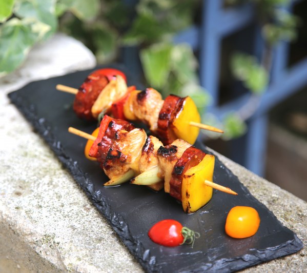 Alternez sur les pics : poulet, chorizo, poivron, oignon et comté. -