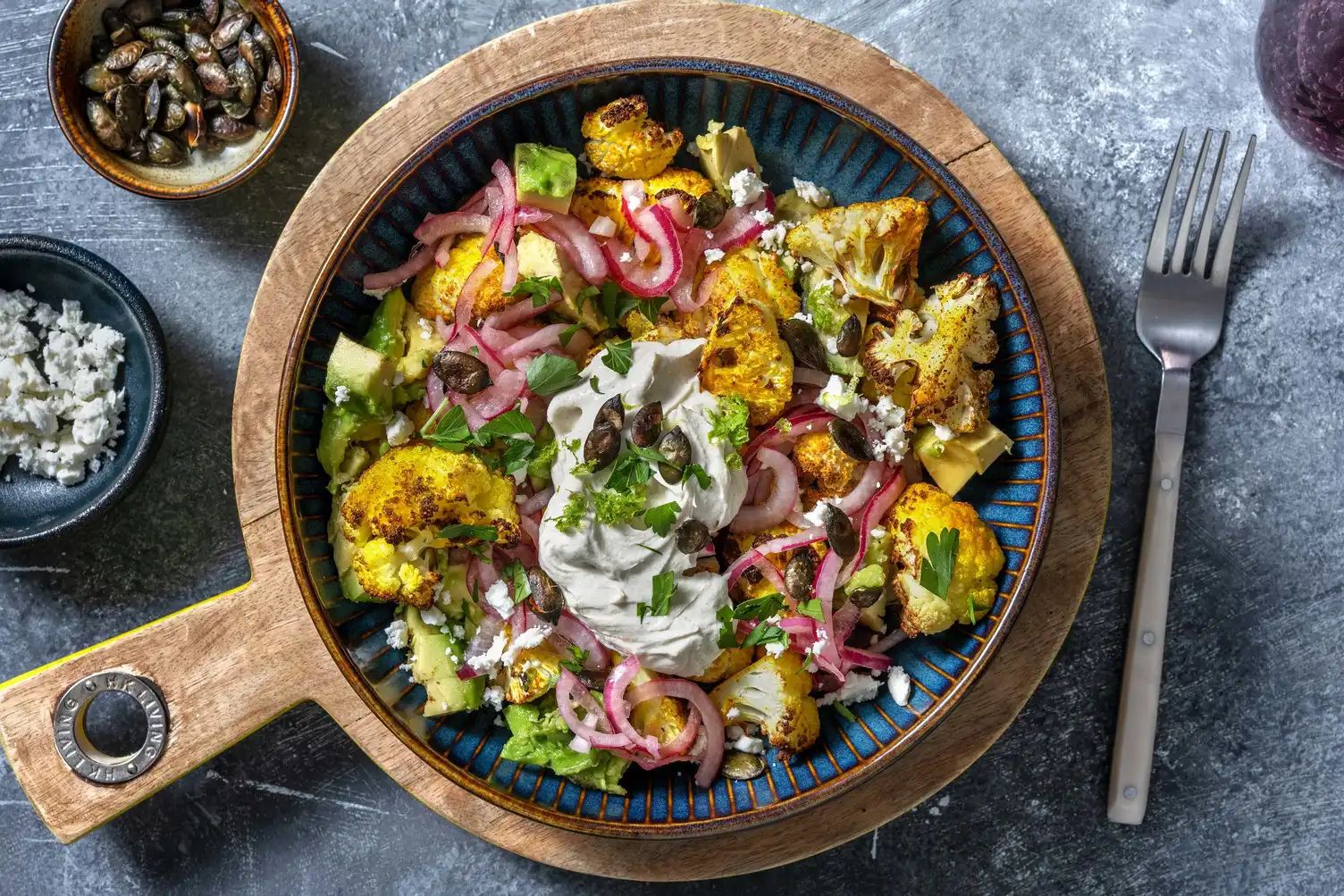Servi avec une sauce au yaourt-tahini et du persil frais, ce plat végétarien mêle chaleur du curry, douceur de l’avocat et fraîcheur du citron vert pour une salade complète, saine et colorée.