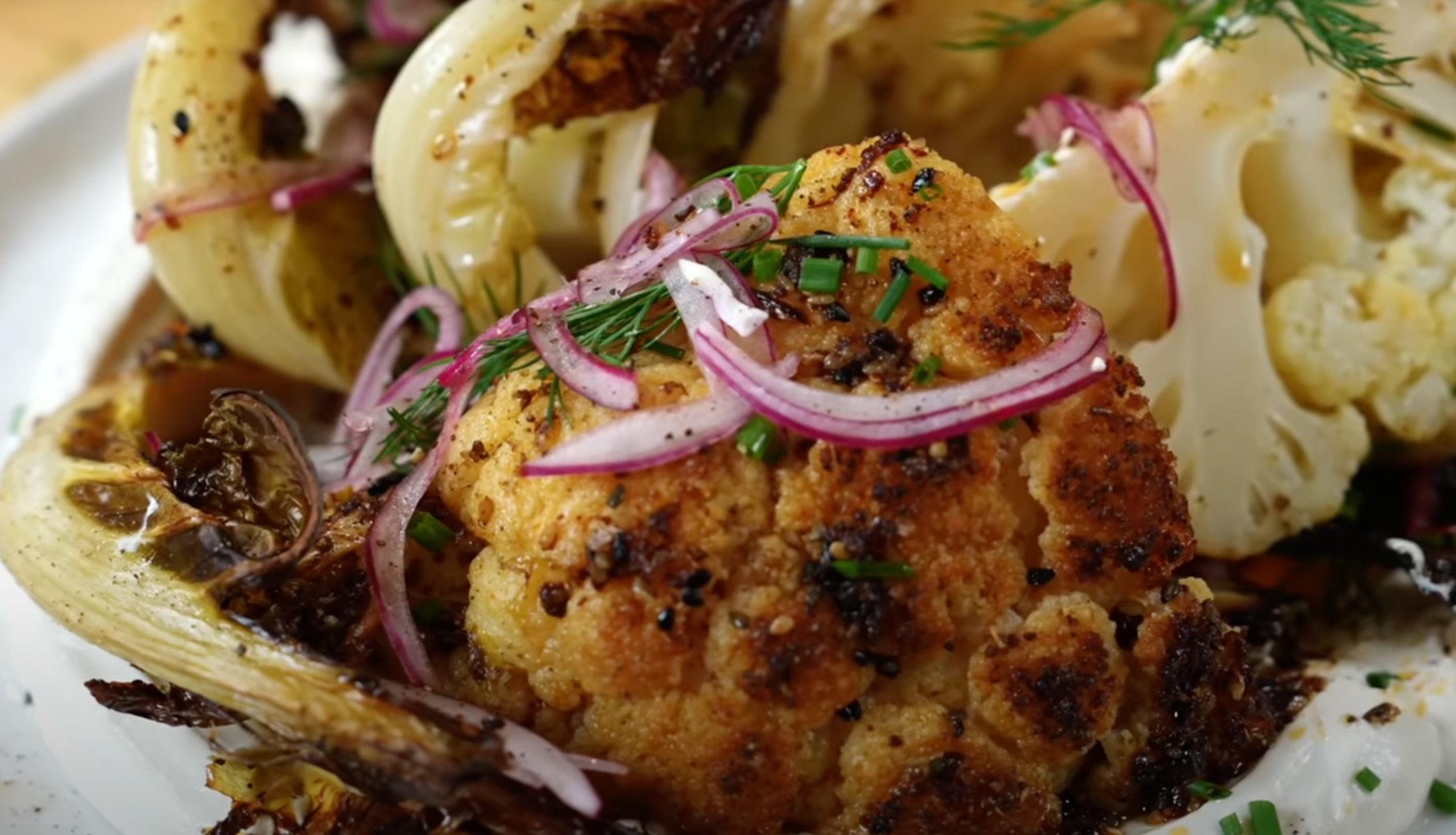 Un chou-fleur crousti-fondant rôti au four avec un mélange d’épices parfumées, servi avec une sauce yaourt-tahini citronnée et des oignons rouges marinés au sumac.