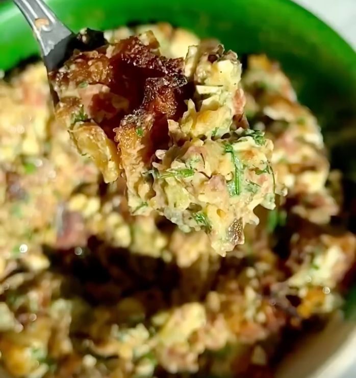 - Dans un bol, mélanger le yaourt, la mayonnaise, la moutarde, les herbes ciselées, les œufs hachés, le bacon et les cornichons coupés en petits morceaux. Ajouter sel et un filet d’huile.