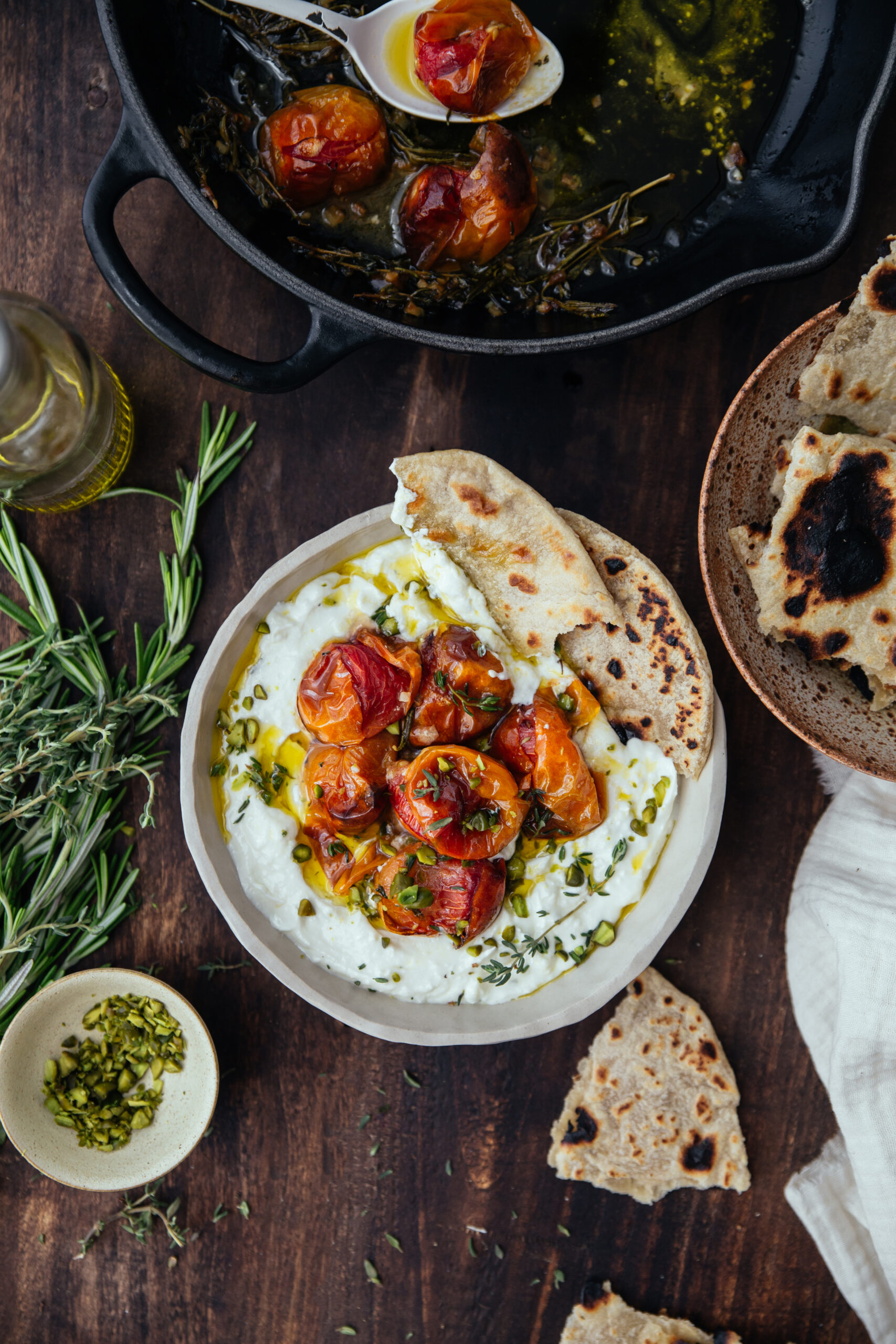 Une crème de feta onctueuse servie avec des tomates cerises rôties au four, parfaite pour l’apéritif ou un repas estival à partager.