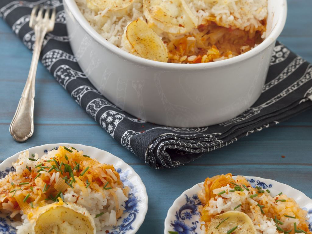 6. Dans un plat à gratin, étalez les 3/4 du riz cuit.