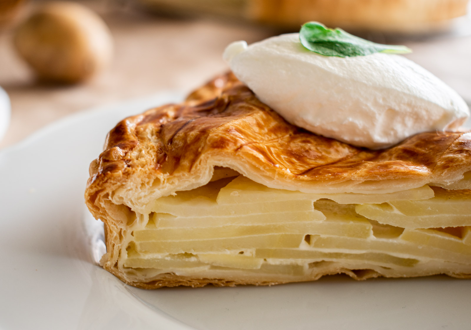 Une tourte rustique et ultra réconfortante : pommes de terre fondantes, crème épaisse, ail et persil enfermés dans deux couches de pâte feuilletée croustillante.