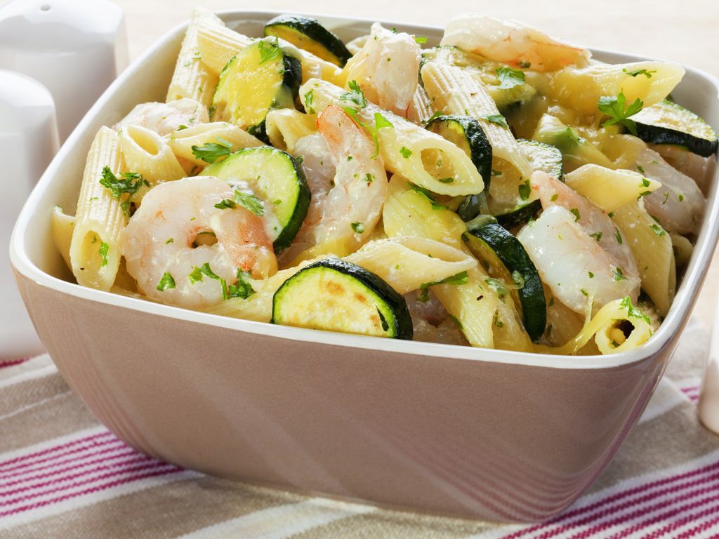 Un plat simple et rapide de pâtes aux courgettes et crevettes, idéal pour un dîner savoureux.