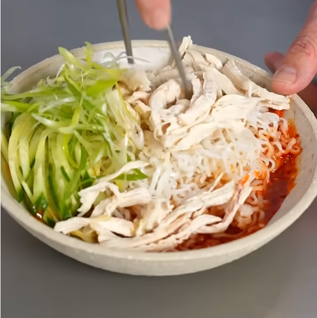 Poulet Effiloché, Nouilles et Bouillon Épicé