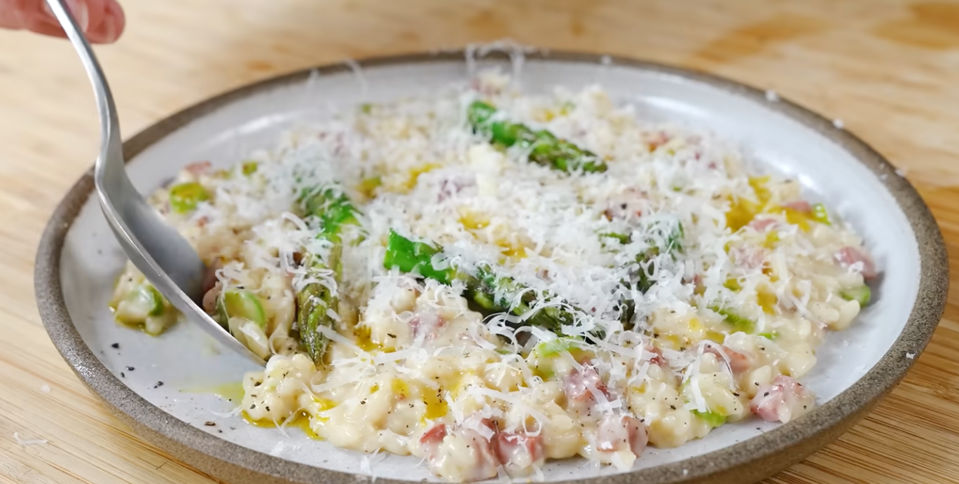 Un risotto ultra crémeux, parfaitement équilibré entre le croquant des asperges et le goût fumé de la pancetta. Le mélange pecorino/parmesan apporte une profondeur savoureuse à la sauce, et le zeste de printemps est omniprésent.