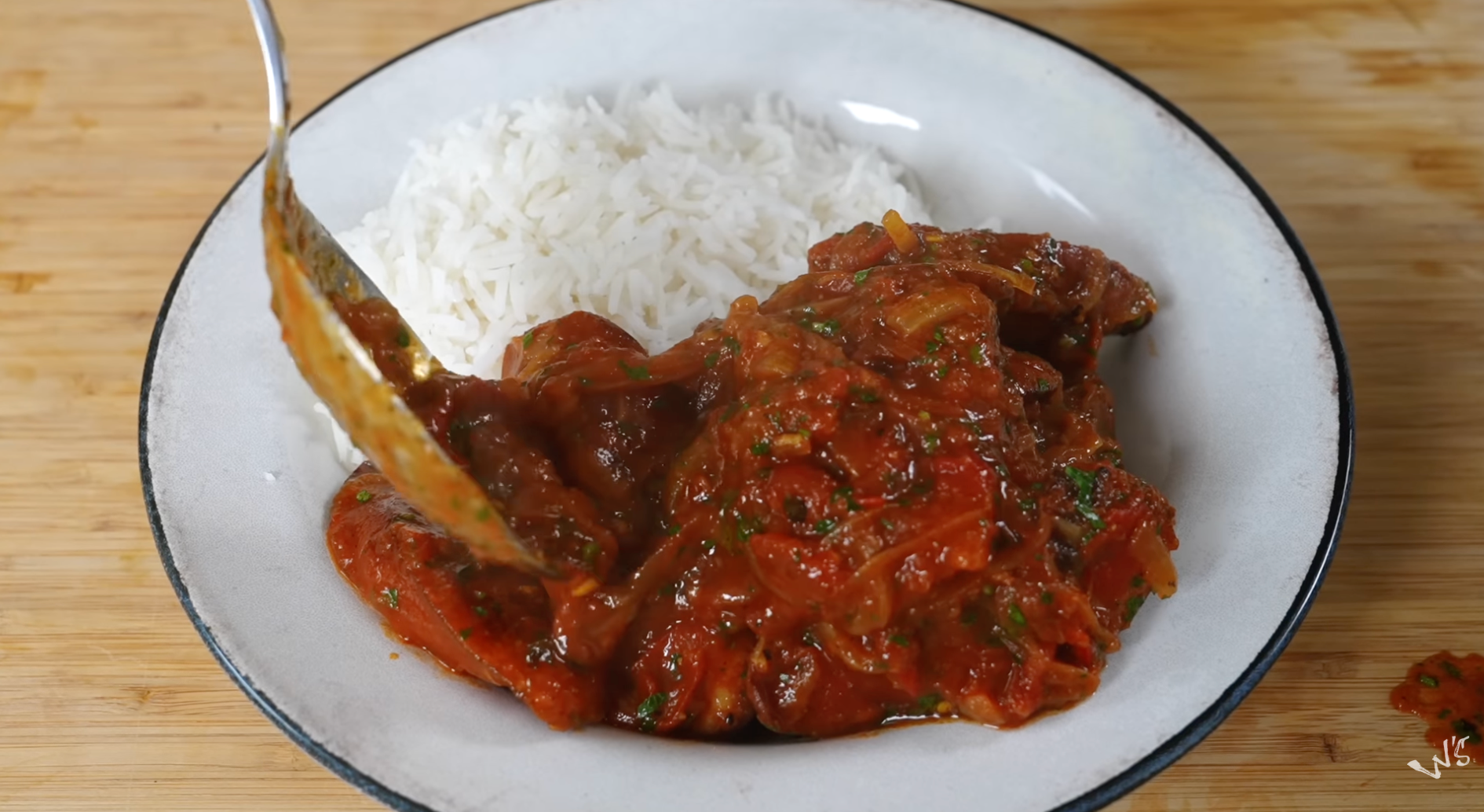 Un classique réunionnais : saucisses fumées mijotées dans une sauce tomate pimentée, servies avec un riz blanc cuit à point.