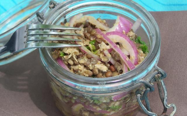 - Dans un saladier, mélanger les lentilles, le thon, l’oignon et la vinaigrette.