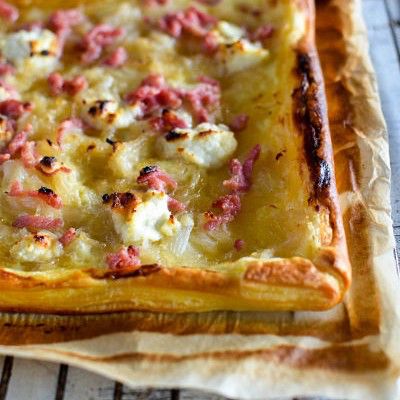 Tarte aux lardons, oignons, chèvre et miel