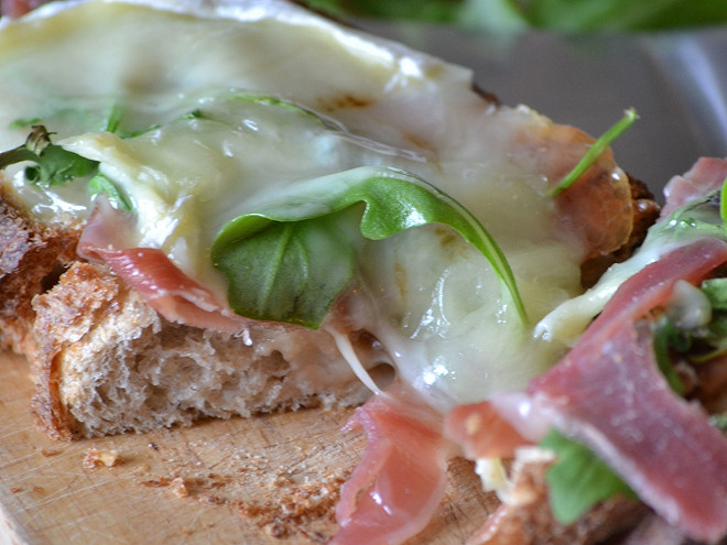 3. Disposez ensuite le jambon cru sur le pain. Ajoutez une petite poignée de roquette dessus.